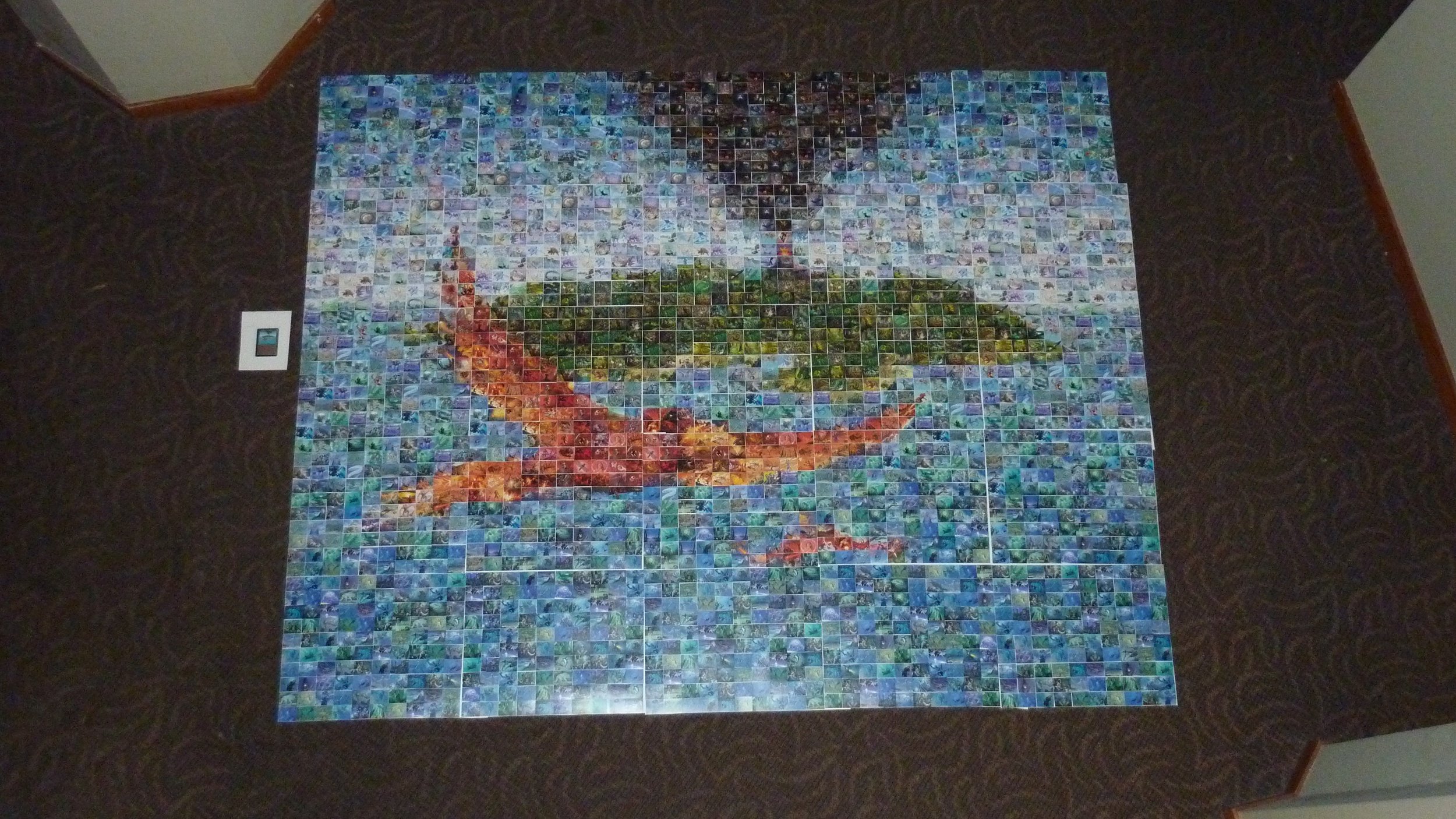 In the spring of 2011, I had a vivid dream of a collage utilizing cut-up Magic: the Gathering cards to create a massive representation of my favorite card, Birds of Paradise. After spending a month or so mulling over the logistics of the idea I decided to pursue it, spending the greater part of two months planning, designing, and building a 2,500-image mosaic. All images were hand-picked by myself, rather than via a machine or algorithm, allowing for intricate details such as the Bird’s eye or an erupting volcano in the background to be matched with thoughtful precision. Anticipating transportation issues, the mosaic was built on a grid system, allowing the approximately 7’x9’ mosaic to be taken apart and reassembled.